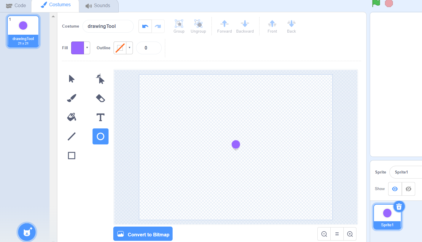 * [ ] We will need a sprite to do the drawing for us - so you should create a new sprite (make sure you are NOT creating a new background!!!!) Your new sprite should be a small circle of an color that you prefer. Place the small circle on the anchor in the center of the screen&#x20;